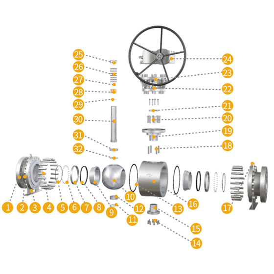 1. 阀体 2. 六角螺母 3. 支脚 4. 螺柱 5. 防尘圈 6. 圆柱弹簧 7. 阀座密封圈 8. 防尘圈 9.阀座 10. 球体 11. 缠绕垫 12. 下轴套 13. 缠绕垫 14. 螺钉 15. 底轴 16. 阀体 17. 吊耳 18. 圆柱销 19. 填料函 20. 螺钉 21. 填料压板 22. 螺柱/螺母 23. 支架 24. 蜗轮箱 25. 填料压套 26. 填料 27. 填料垫 28. 上轴套 29. 缠绕垫 30. 阀杆 31. 球体轴套 32. 防尘圈