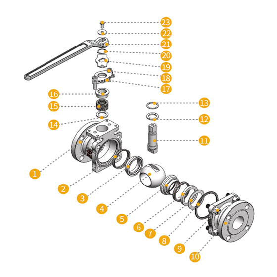 1. 左阀体 2. 阀座密封圈 3. 出口阀座 4. 球体 5. 进口阀座 6. 压圈 7. 碟簧 8. 密封垫片 9. 螺母/螺柱 10. 右阀体 11. 阀杆 12. 对开环 13. 止推垫 14. 填料垫 15. 填料 16. 填料压套 17. 填料压板 18. 螺钉 19. 限位板 20. 弹性挡圈 21. 手柄 22. 垫片 23. 六角螺栓